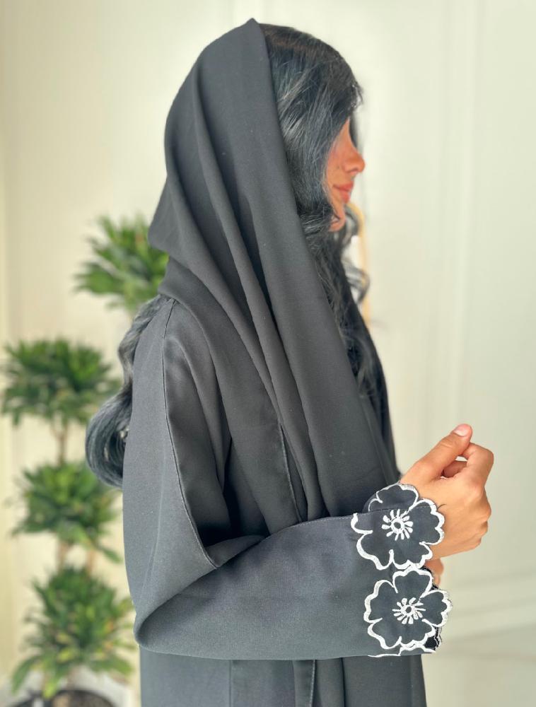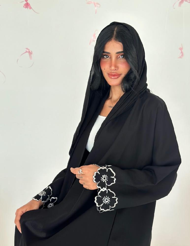وتأتي الاكمام واسعه بتطريز الوردات باللون الابيض وطرف العباية من الاسفل بتطريز الوردات باللون الابيض وخيوطه متينة ومتماسكة،
