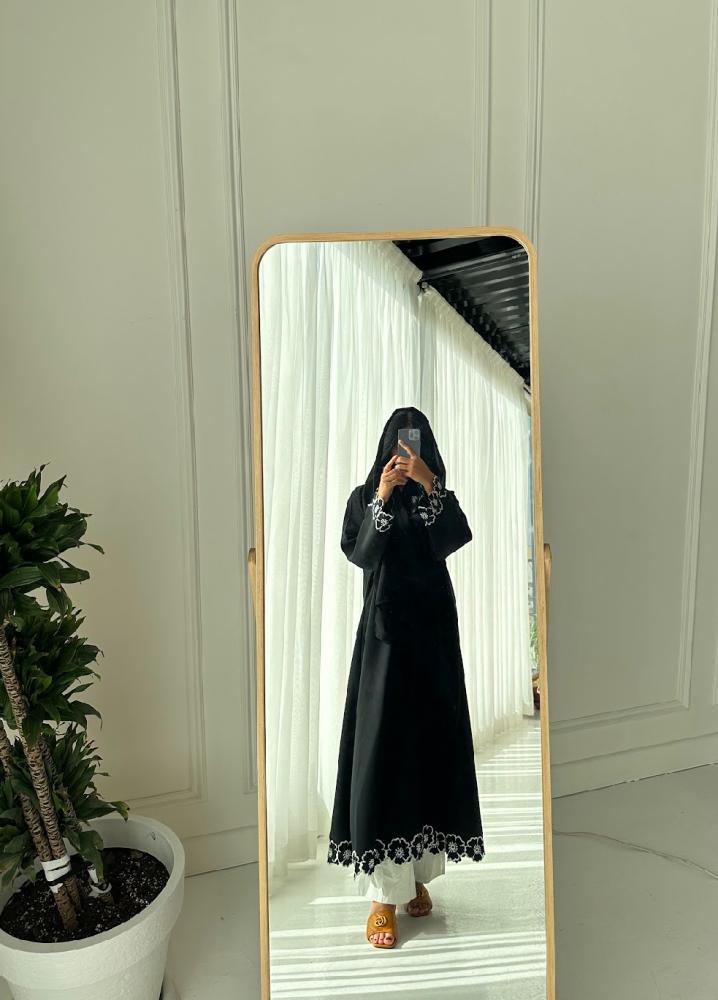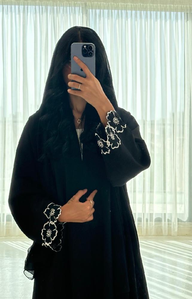 عباية سوداء بتطريز ناعم للوردات تضفي أناقة ونعومة على العباية.