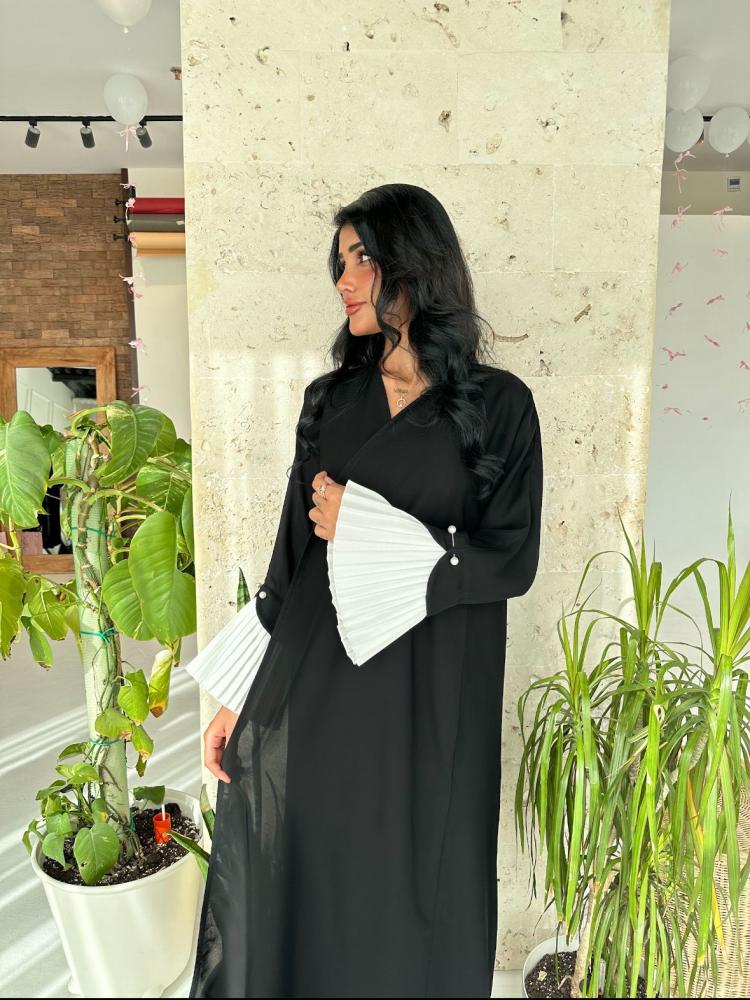 تتألق العبايه بنهاية الأكمام بقماش أبيض كسرات يبرز جمال العباية
